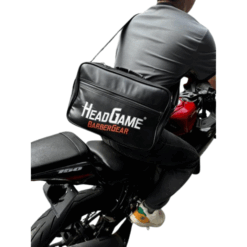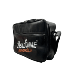 The bag is black with a smooth, leather-like texture. The brand logo, “HEADGAME BARBERGEAR,” is prominently displayed on the front in white and orange lettering. It has a main zippered compartment on top and an additional zippered pocket on the front for easy access to smaller items. A detachable shoulder strap and a padded handle provide multiple carrying options. The zippers and hardware appear to