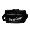 The bag is black with a smooth, leather-like texture. The brand logo, “HEADGAME BARBERGEAR,” is prominently displayed on the front in white and orange lettering. It has a main zippered compartment on top and an additional zippered pocket on the front for easy access to smaller items. A detachable shoulder strap and a padded handle provide multiple carrying options. The zippers and hardware appear to