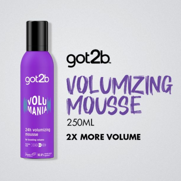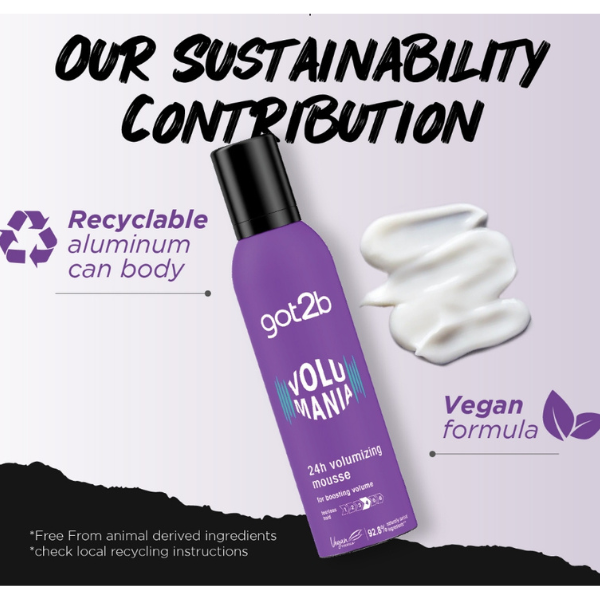 Turn up your hair volume! got2b Volumania 24h Volumizing Mousse give your hair the push-up effect of your dreams. Get insane volume from root to tips and fearless hold for up to 24hours. This got2b Volumania 24h Volumizing Mousse creates boosting volume from roots to tips. This special formula gives 2x more volume with fearless hold for the entire day. Best of all, the vegan* formula contains 92.8% naturally derived ingredients**. On top the can body is made from 50% recycled aluminium.
