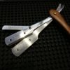 New swing lock style razors are made of high-grade steel. The handle is made of natural Indian Wood. It includes a free artificial leather pouch.